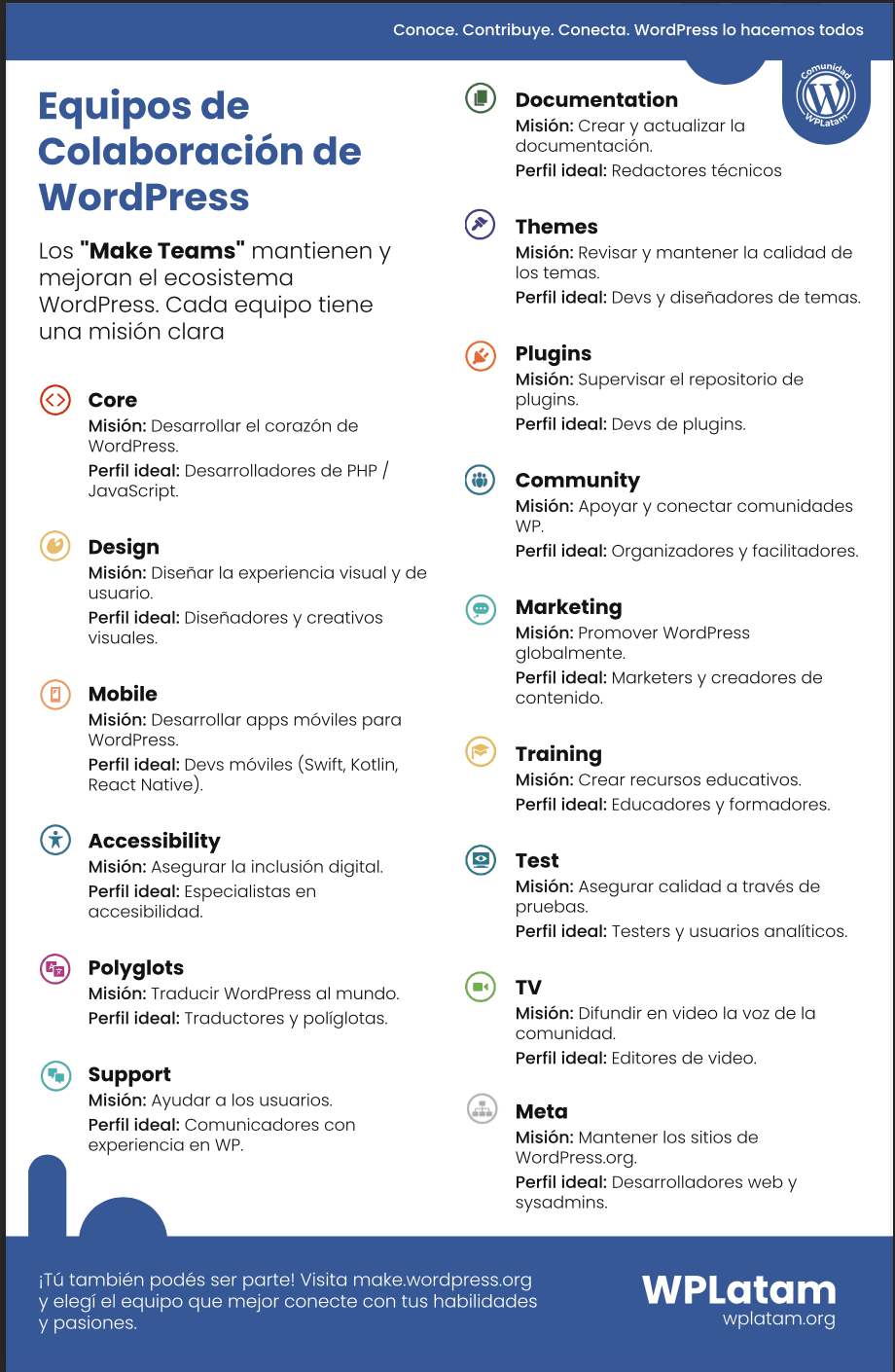 Primero que todo aclaramos dudas sobre que es la comunidad, que es WordPress.org y WordPress.com, como ser parte, y por que ser parte de la comunidad local y global. Cuales son los equipos que hay y los que cada uno de los participantes pueden colaborar. Para eso la comunidad WordPress Latam elaboro este documento donde se detalla cada uno de los equipos en los que podemos apoyar como voluntarios.